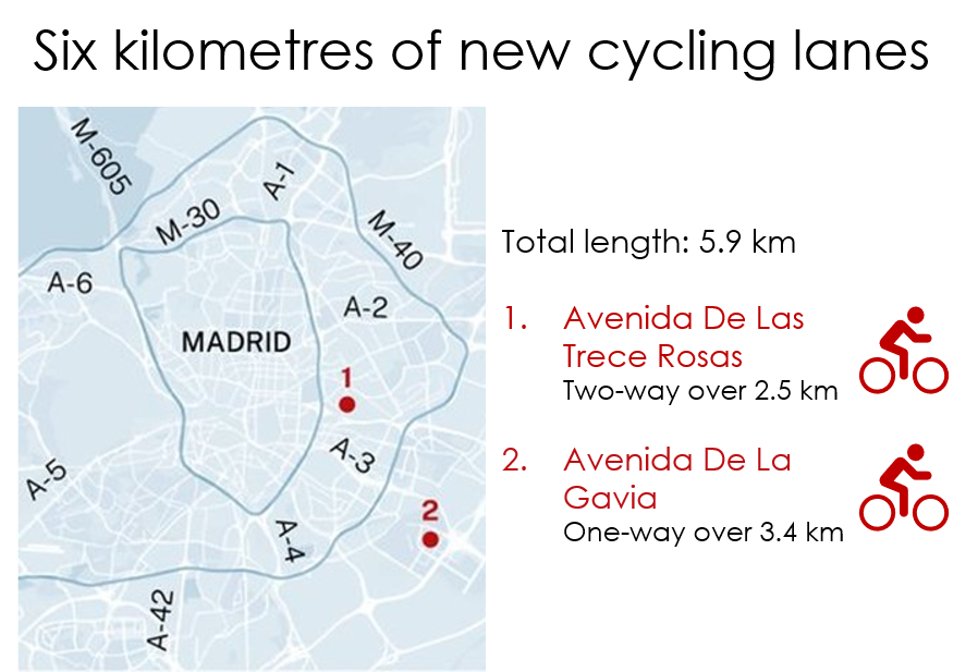In less than two years since 2019, the city has added 21.36 kilometres of cycle lanes, routes that give continuity to other pre-existing ones, according to the City Council. In the summer of 2020, 12 kilometres were enabled through six cycle lanes located on Avenida de Burgos (2 km), Paseo de las Delicias (1.75 km), Ribera del Sena-Vía Dublín (1.5 km), Méndez Álvaro (1.75 km), Paseo Camoens-Ruperto Chapí (1.35 km) and Avenida Daroca - Largo Caballero - Avenida de Arcentales (4 km). The one on Avenida de Burgos joins the Anillo Ciclista and the cycle lane on Calle Castillo de Candanchú in Tablas, to create a north-south axis from the northern extensions. The one on Paseo de las Delicias links the Madrid Río cycle path and the cycle lane on Paseo de la Chopera with the future cycle lane on Paseo de la Castellana.